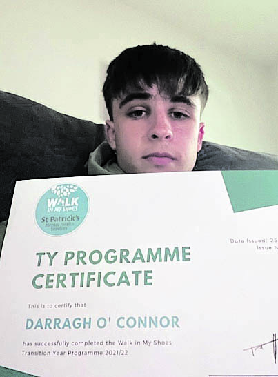 Darragh O’Connor from the Patrician Academy in Mallow joined Transition Year students across Ireland to graduate as a Walk in My Shoes mental health ambassador during a special online ceremony held to celebrate the class of 2021/2022. For over 10 years, Walk in My Shoes, the flagship education and awareness-raising campaign of St Patrick’s Mental Health Services, has run a Transition Year programme inviting over 100 students from across Ireland to take part each year. The week-long programme runs five times during the academic year between October and March, with 20 to 25 students per programme.
