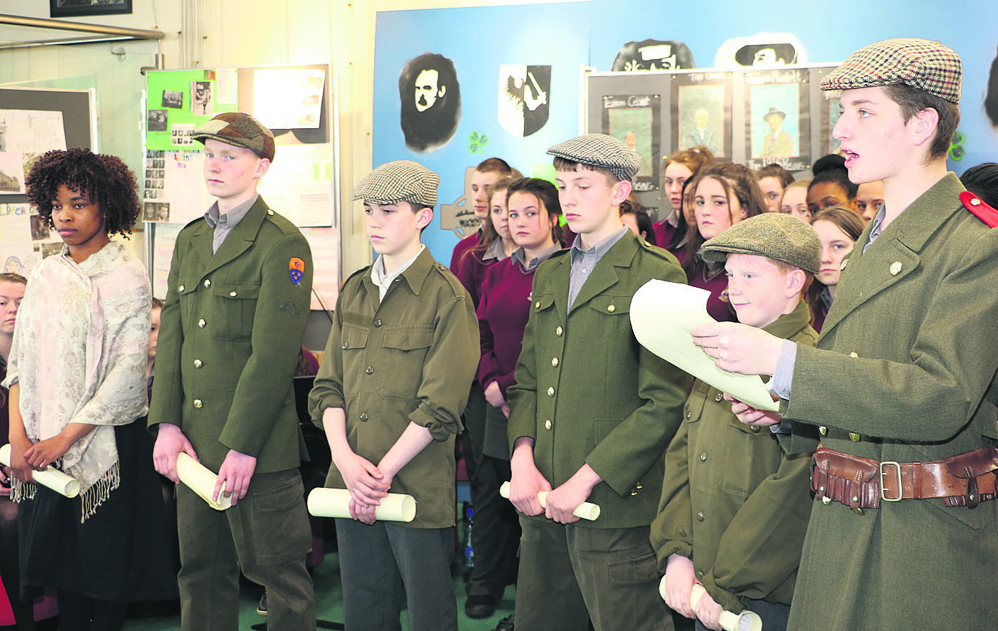 Drawing inspiration from the bravery displayed by the heroes of 1916, our students put on an artistic, musical and dramatic display commemorating our national heroes. There were numerous artistic and informative displays showing everything from the timeline of the Rising to fact files on the signatories, and a model GPO, to medals remembering all who were executed. This display provided a backdrop for the wonderful choir, mentored by Ms. Hannon, singing ballads including ‘A Nation Once Again’ and ‘Amhrán na bhFiann.’ As a reminder of the story of the Rising, students donned their army uniforms and dramatised the history of the nationalist movement. We were entertained by memorable re-enactments of the founding of the GAA, Pearse’s speech at the graveside of O’Donovan-Rossa’s and finally the executions of the signatories to the Rising. The event culminated in a reading of the Proclamation for the 21st century, outlining the hopes, aims and ambitions which our students have for the Ireland they are born into.