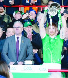 Limerick captain Cian Lynch receives the Allianz National Hurling League Division 1A trophy from GA President Jarlath Byrnes. – Photo by P. Gallagher