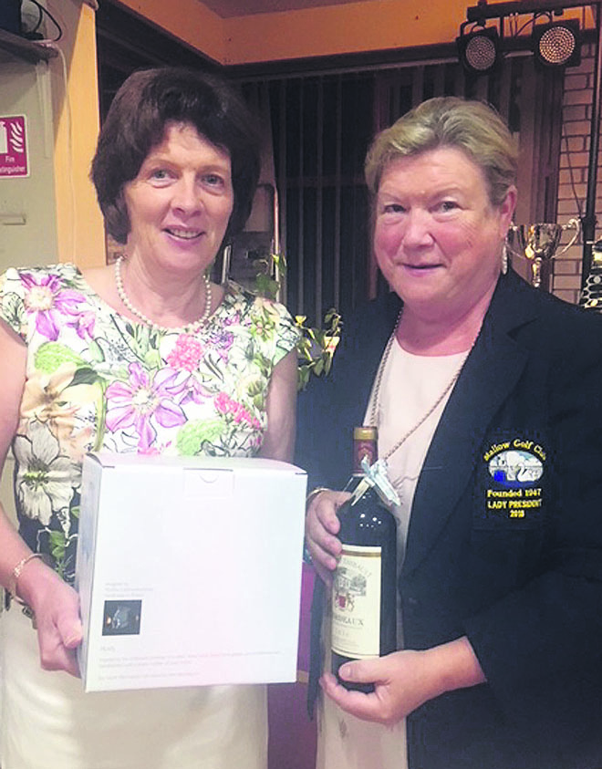 After the golf, everyone gathered in the club for a wonderful night of food, prize-giving and celebration. Lady President Lily has to be delighted with the night which she provided for the ladies’ club. From beginning to end (very late!), it just worked. Lily’s sisters, family, guests (school friends) and committee did their level best and succeeded to make it a night to remember. People gathered early in the nicely decorated dining room to partake in an excellent, as ever, meal provided by Dave and staff. Melanie, Siobhan, Noreen and Ka joined in the general banter and minded their members well. Susan (baby sister) started proceedings as MC and called on the woman of the evening to say a few words. Lily spoke eloquently, issuing thanks to family, committee, Lady Captain Marcella, Captain John Liston and President Patsy Browne for making her year such a pleasant one. She made particular mention of the President’s wife Helen Browne as well as the three beginner members who attended. Her proudest moment of the year was the incredible success of the ‘Play in Pink’ event which raised €3,000 for Breast Cancer Research, and she thanked all for their contributions to her chosen charity, Arc House. She then called on Helen Browne to say Grace and the festivities began. Dave seems to surpass himself with every event, and the food on the evening had to be seen to be believed. The constant flow of people to obtain seconds bore testament to that. We are lucky in Mallow to have his services. The meal over, we waited in anticipation to hear of the chosen few who would be lucky enough to receive prizes on the night. The prize table had been transported from upstairs to down, and lost none of its splendour in the process. Rumours abounded of 38s and 39s in difficult conditions, the afternoon people feeling a bit aggrieved that they had to play in the rain! Pauline Hegarty emerged as a very popular winner with a steady 39 points. The fact that she had never won a Captains or President’s Prize made it all the more pleasurable.