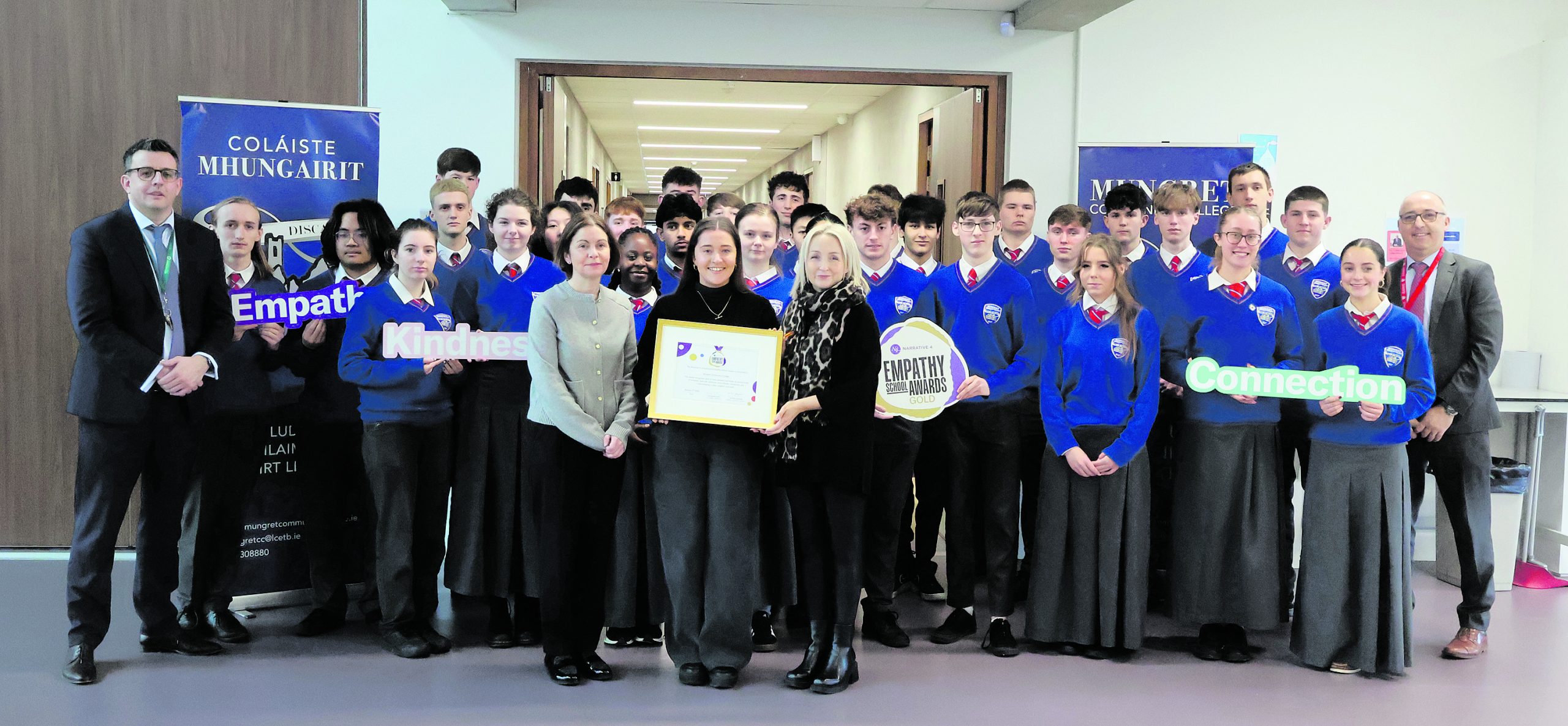 Mungret Community College in Limerick has reached new heights in education, becoming the first school in Munster to achieve the Narrative 4 Gold Empathy School Award, and the third school in Ireland to do so. This landmark achievement builds on the school’s previous Bronze and Silver Awards, demonstrating its unwavering commitment to fostering empathy and connection in its school community.