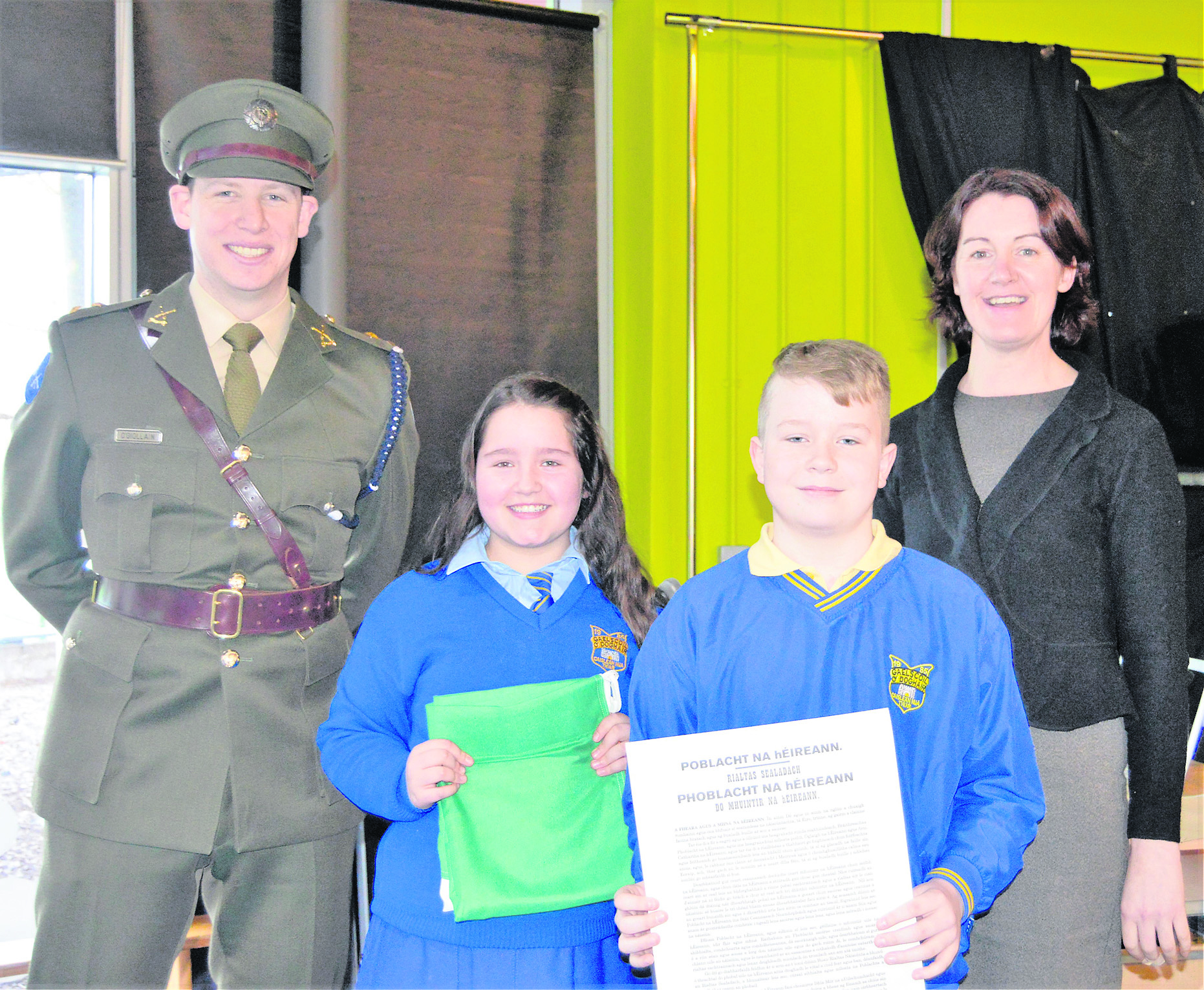In line with the Flags for Schools Initiative to commemorate the centenary of the 1916 Rising and to celebrate 100 years since the Proclamation of the Irish Republic, the Government has tasked Óglaigh na hÉireann with delivering a National Flag to every Primary School in the country. This key part of the Ireland 2016 commemorative programme was celebrated in Gaelscoil O’Doghair on Monday 8th when a member of Óglaigh na hÉireann, in uniform, visited the schoolchildren, teachers and parents in the Gaelscoil. Following the reading of the 1916 Proclamation, a copy of the Proclamation and the National Flag were formally presented to the pupils.